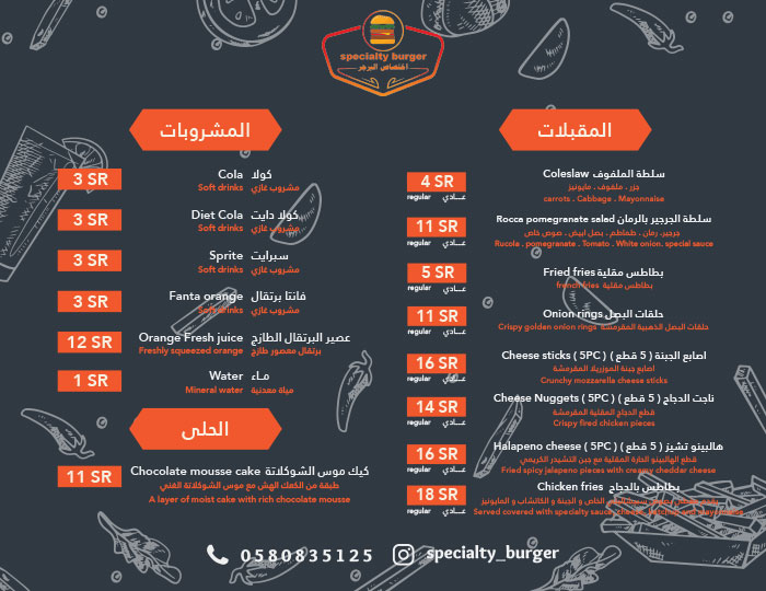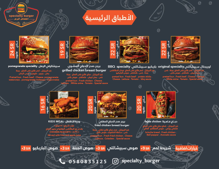 عيش المتعة مع اختصاص البرجر عرض نوفمبر من اختصاص البرجر بخصم ٣٠٪ على جميع الأصنافمن الساعة ١ ظهرا إلى ٤ فجرا اختصاص البرجر أصل كل طعم لذيذ اطلب الآن المنيو انستقرام: Specialty_burgerسناب شات: Specialty burger جدة – حي السلامة – شارع قريش امام فندق راديسون بلو